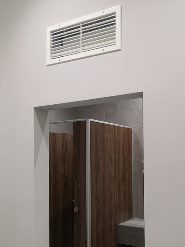 За да покрием високите изисквания на клиента, изградихме изцяло нова вентилация, за която ползвахме автономен термопомпен рекуперативен модул с EC вентилатори, с дебит на подаване 2900 м³/ч. Циркулацията е осигурена от множество таванни решетки, конусни смукатели и трансферни решетки. Вентилацията е изпълнена от изолиран спирално навит въздуховод от поцинкована ламарина и гъвкави въздуховоди. Външното тяло, което избахме е термопомпа – LG UU85W.U74, заедно с кит и вътрешно стенно управление.